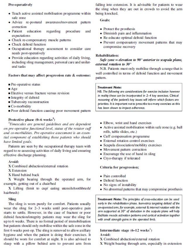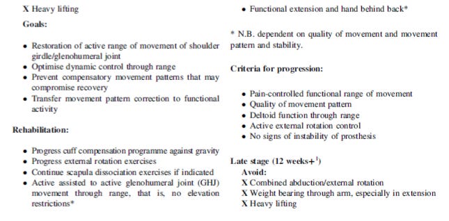 The full details of their results, including range of movement, pain levels, and patient reported outcome measures, of their patients who followed these guidelines of are found in their paper. What I am most interested in is the precautions and late stage (>12 weeks+) rehabilitation. Late stage precautions differ to a total shoulder arthroplasty where guidelines only suggest avoiding large loads through the upper limb (Blacknall and Bidwai, 2020; Kennedy et al., 2020).